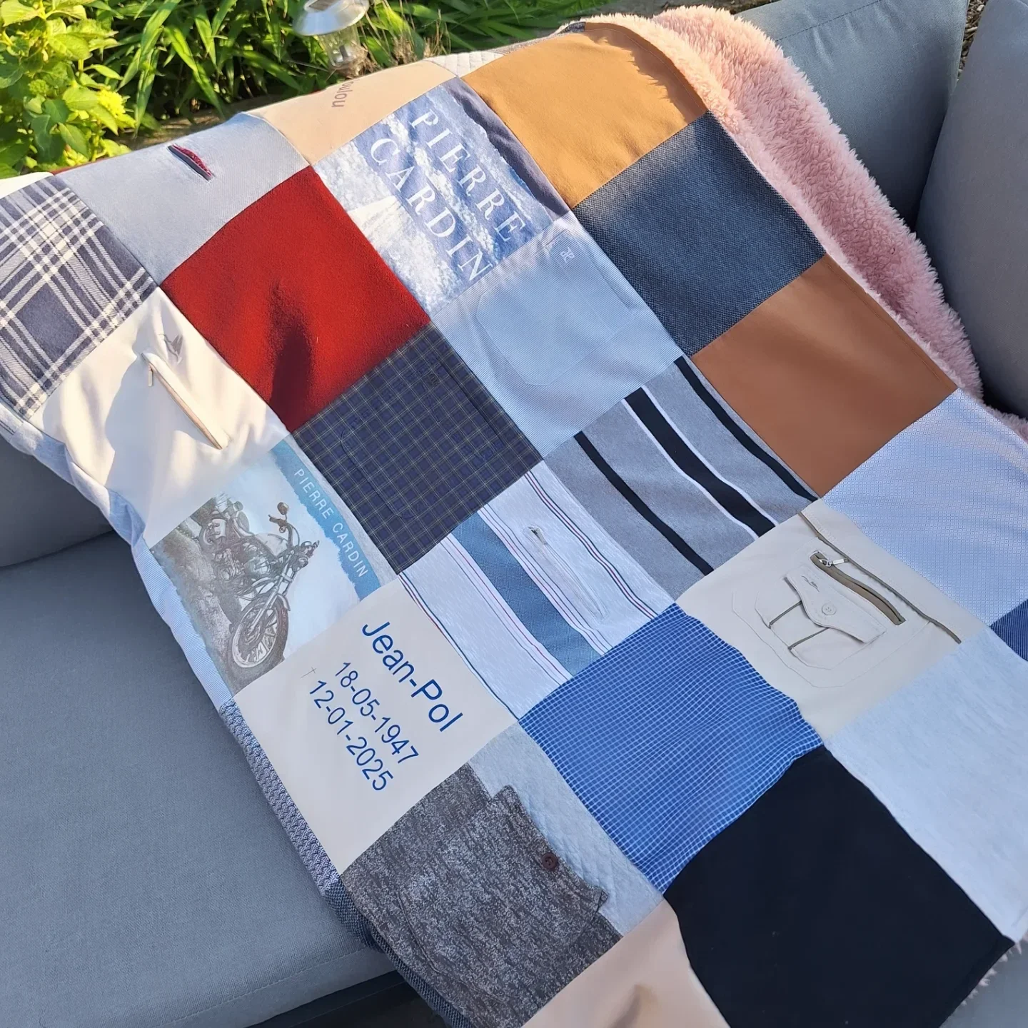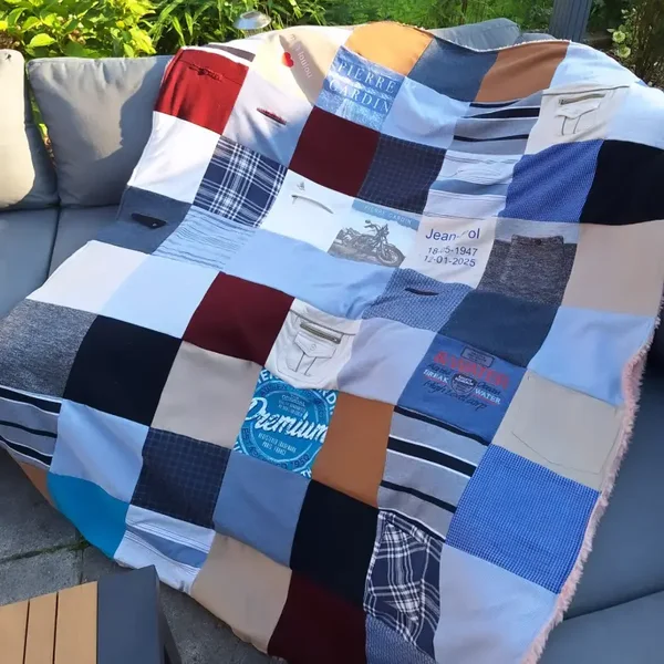 Een Troostdeken is een bijzonder en troostrijk product, gemaakt van de kleding van een dierbare die je bent verloren. Elk stukje stof vertelt een verhaal en biedt een tastbare herinnering aan hun leven. Dit deken biedt niet alleen warmte, maar ook een gevoel van verbondenheid en comfort, terwijl je de herinneringen aan je geliefde levend houdt.